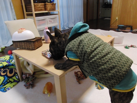何度もおもちを乗せて写真撮影する1号。