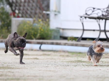 ③ワンコが大ぽん追いかけて走りだす。