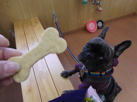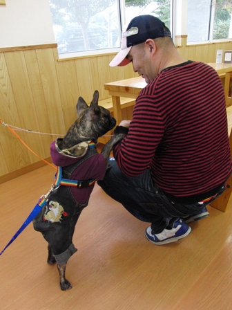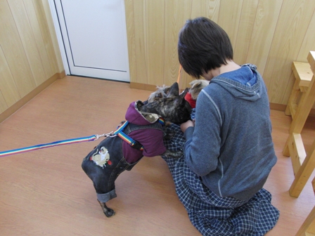 ①スタッフに抱っこされてるワンコ放される。
